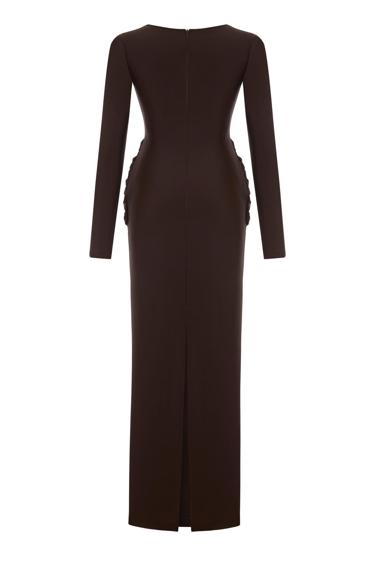 Uzun kollu, arka gizli fermuarlı, önü bağlama detaylı, arka yırtmaçlı maksi elbise. Farklı bağlama şekilleriyle çok yönlü kullanım sunar.